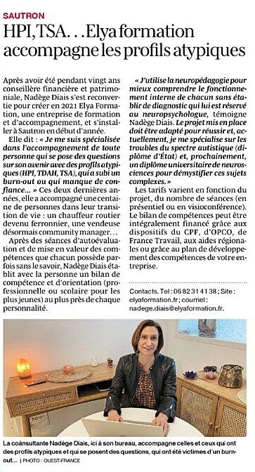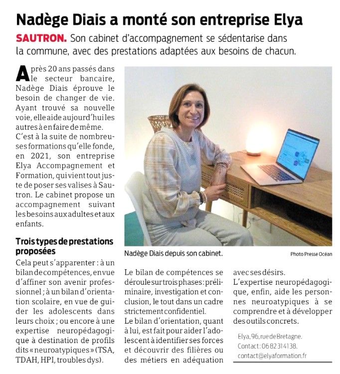 Fondée en 2021, Elya Accompagnement déploie désormais son expertise à Sautron. Depuis plus de quatre ans, je vous accompagne dans vos transitions de vie avec un engagement simple : révéler votre architecture de talents pour dessiner une trajectoire qui a du sens.